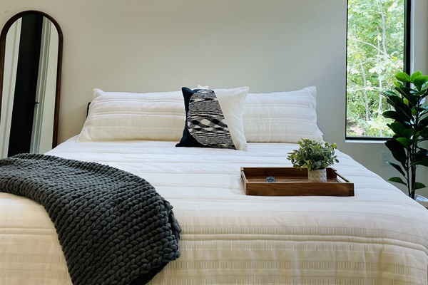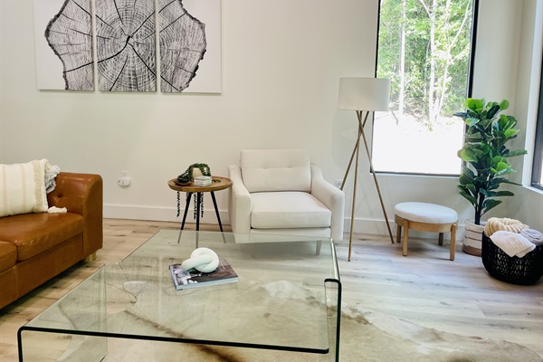 Cozy up on the couch and enjoy the views of the woods or watch your favorite shows